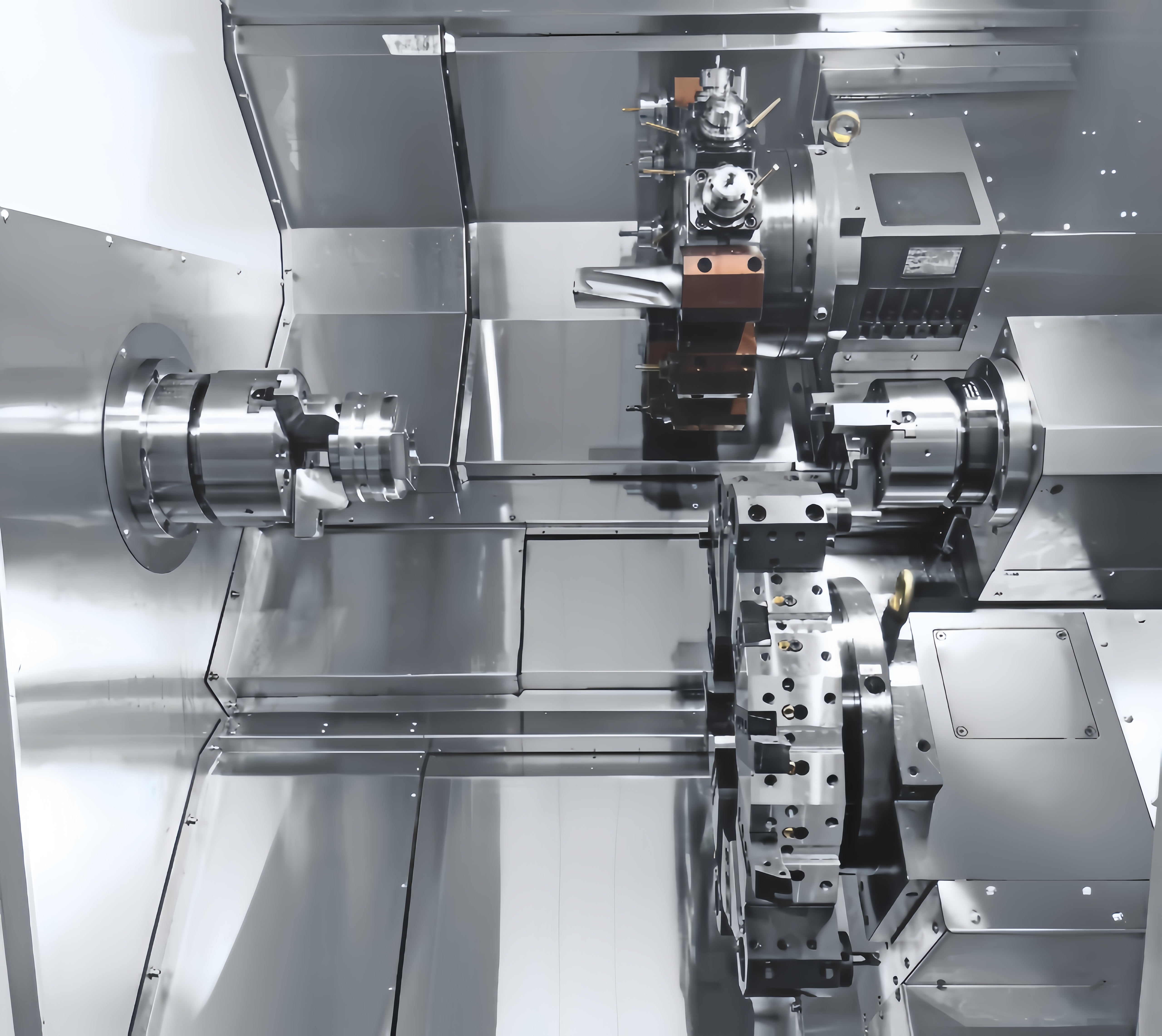 ▼4聯動雙主軸同時加工,雙主軸雙刀塔設計,在多軸多通道的CNC系統及後處理程式控制下,不僅可完成4軸聯動加工,還可以實現零件自動調頭加工、同時開粗精車,具備兩個主軸工序互不干擾加工等一系列多功能。
